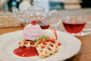 ワッフルメーカーは予熱がポイント。強く押しすぎると平たくなりすぎるので注意です。表面のカラメル化を楽しむなら、グラニュー糖は多めでもOK。アイスクリームを添えれば、デザート感がグッとアップしますよ。